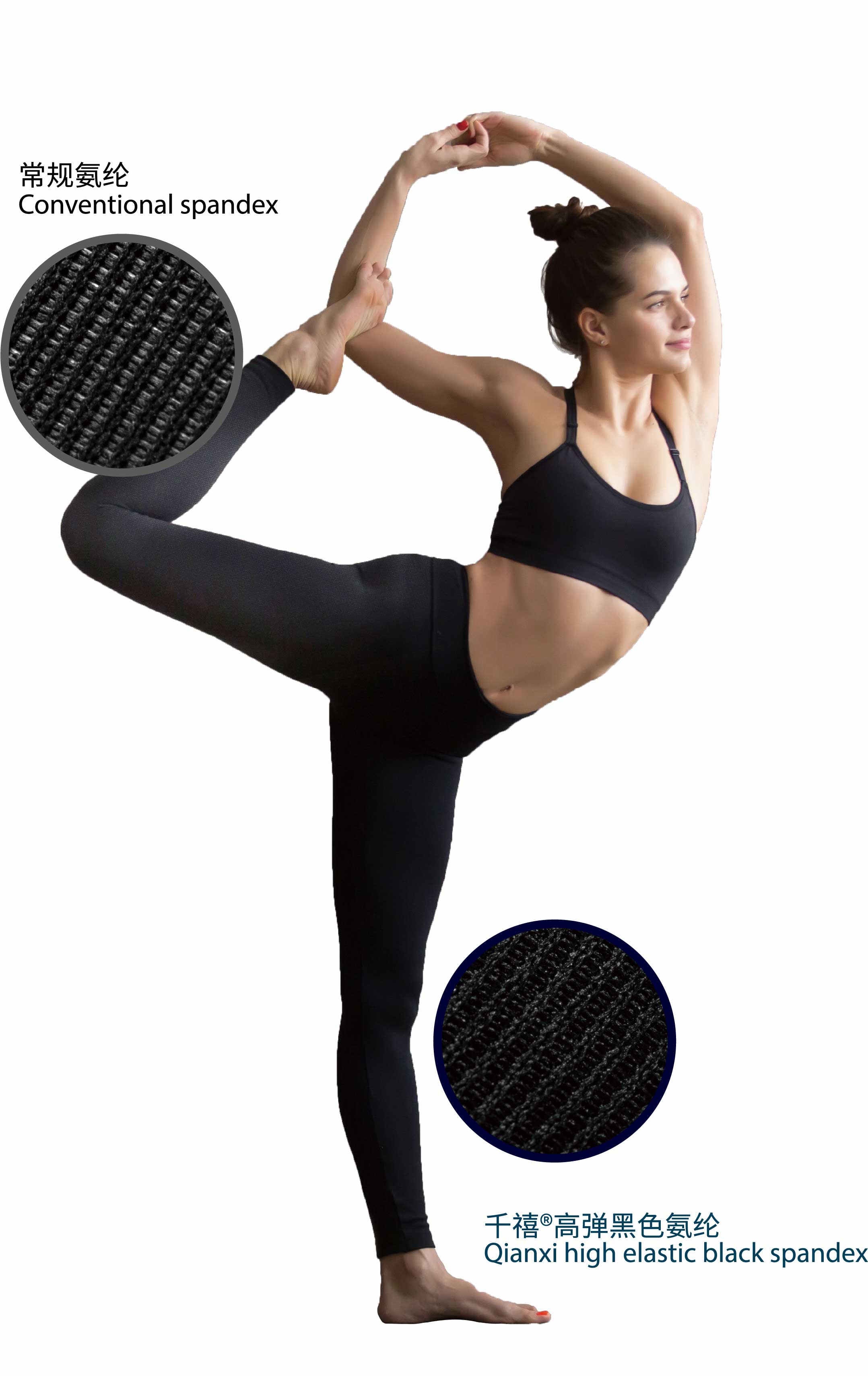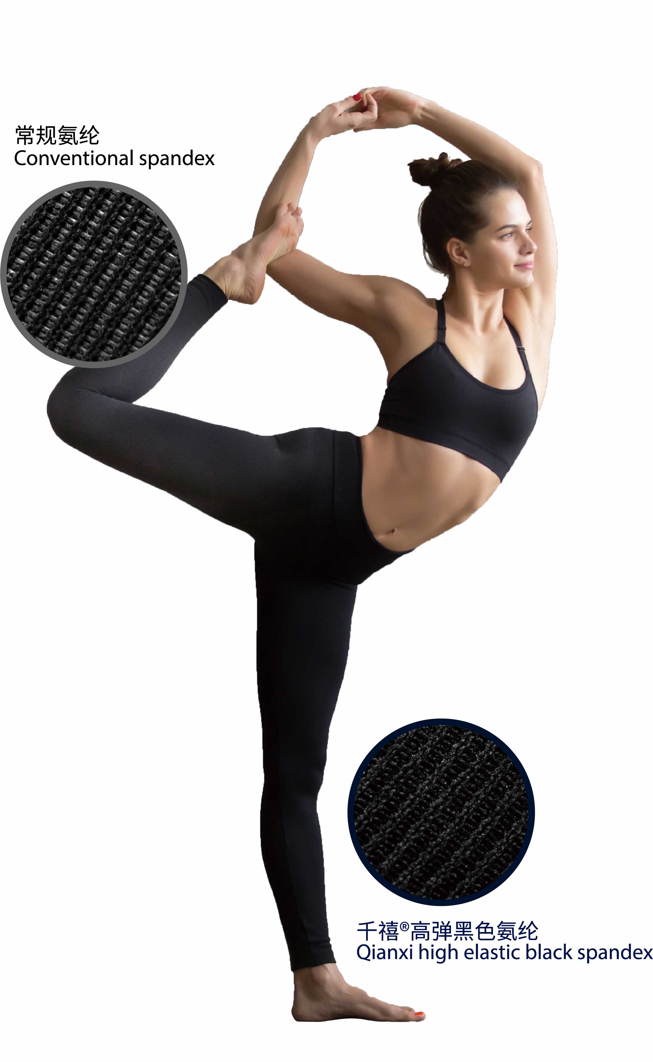 將黑色元素均勻地分散在纖維中,使紡織面料呈現(xiàn)出持久的色牢度,解決傳統(tǒng)氨綸在深色面料中因?yàn)椴簧仙斐傻穆栋讍栴},同時(shí)減少染色帶來的環(huán)境污染,滿足包紗、緯編和經(jīng)編等織造工藝需求。