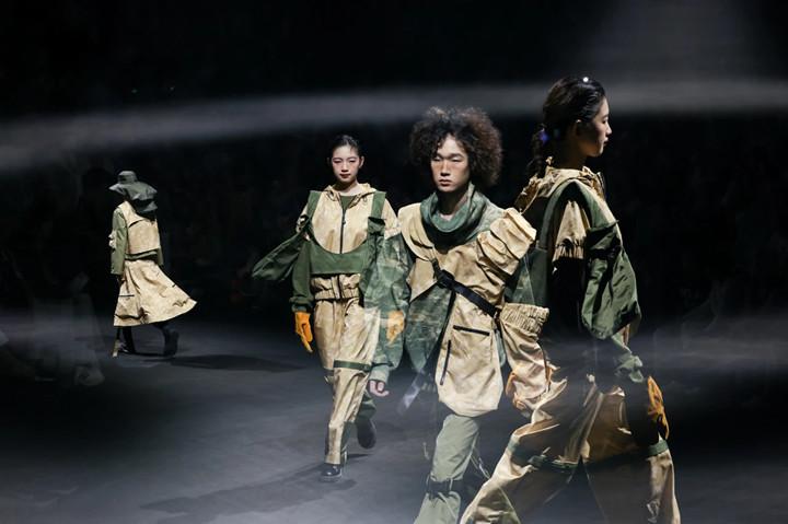 首批入庫品牌發(fā)布之后,一場(chǎng)定位于“未來運(yùn)動(dòng)美學(xué)全景演繹”的泛運(yùn)動(dòng)超級(jí)大秀精彩上演。這場(chǎng)大秀匯聚了在首屆“千禧”杯服裝設(shè)計(jì)大賽中涌現(xiàn)出的60套優(yōu)秀設(shè)計(jì)作品。中國青年設(shè)計(jì)力量以多元化的運(yùn)動(dòng)項(xiàng)目為載體,融合攀巖、滑雪、徒步、露營(yíng)、潛水、劍術(shù)等多種戶外體驗(yàn),通過前沿材料的創(chuàng)新應(yīng)用,探索運(yùn)動(dòng)時(shí)尚的全新邊界,展示纖維材料在功能性、舒適性和創(chuàng)意表達(dá)上的無限可能。大秀從科技感和極限運(yùn)動(dòng)為主調(diào)的戶外探險(xiǎn)拉開序幕,到動(dòng)感與時(shí)尚的城市運(yùn)動(dòng)系列,再到輕松舒適的山野漫步系列,最后以充滿童趣的溫馨畫面結(jié)尾,也象征著未來的希望。