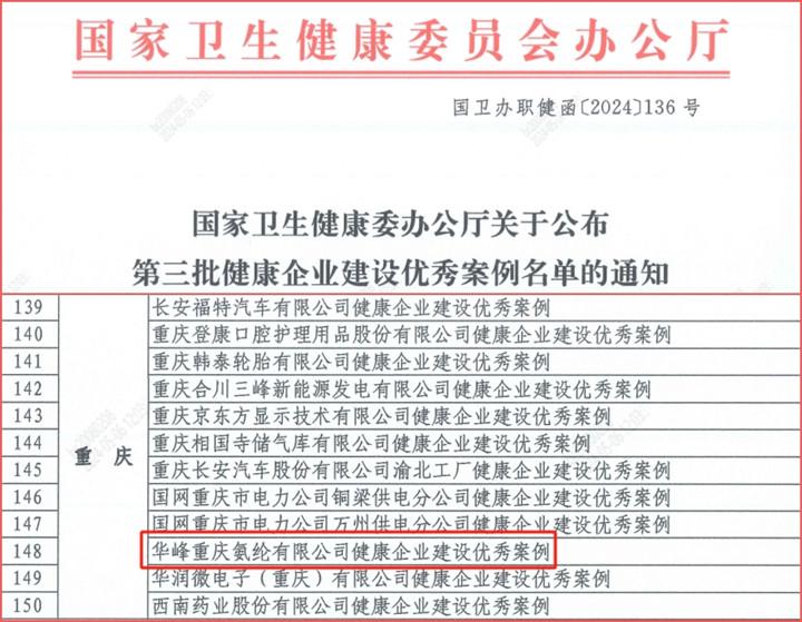 日前,國(guó)家衛(wèi)生健康委辦公廳公布第三批健康企業(yè)建設(shè)優(yōu)秀案例名單,華峰重慶氨綸有限公司成功入選,是重慶市本次獲評(píng)12家企業(yè)之一,也是涪陵區(qū)歷年以來(lái)唯一上榜的企業(yè)。